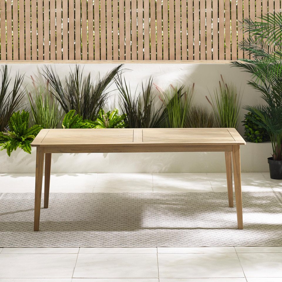 Constructed from solid acacia wood with a light teak colour stain, which makes it durable and unlikely to fade. Assembly required - easy to follow instruction included. Comes with 1 year warranty for peace of mind. Why not pair with any of our outdoor dining chairs to create a unique outdoor dining set?